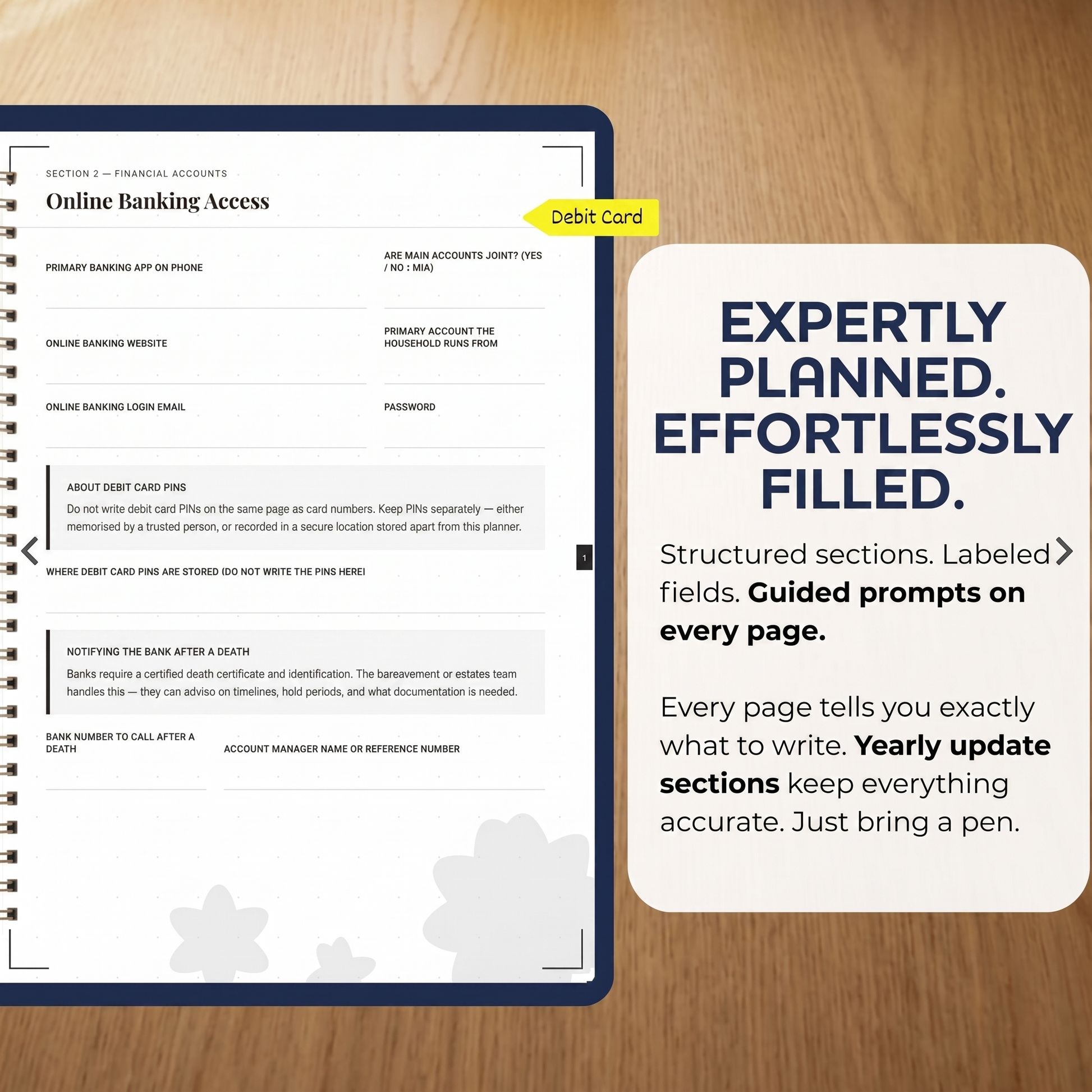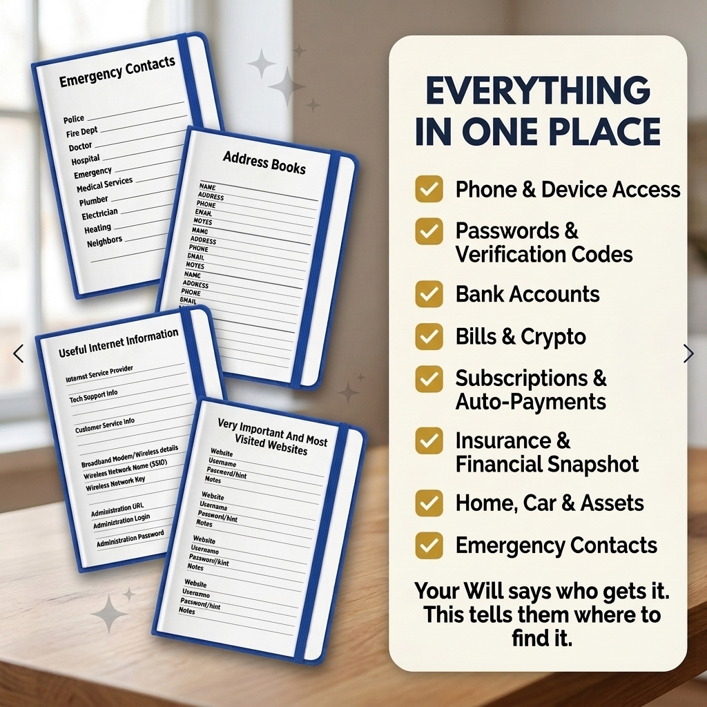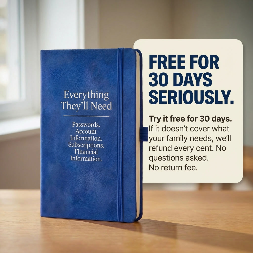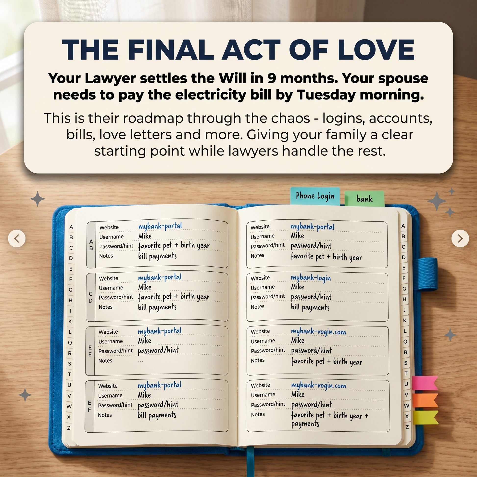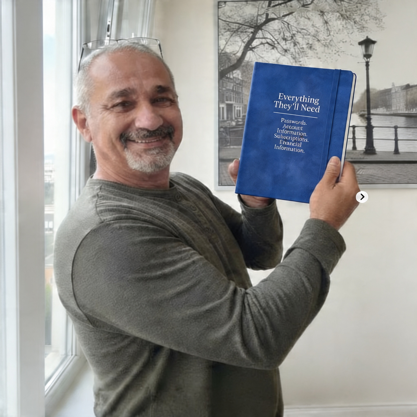 "Nobody warns you about the phone calls. The hold music. The death certificates you have to mail. I spent four months chasing down accounts after my dad passed instead of actually mourning him. This book exists so my kids don't have to do what I did. Every blank line filled in is one less nightmare for them later."