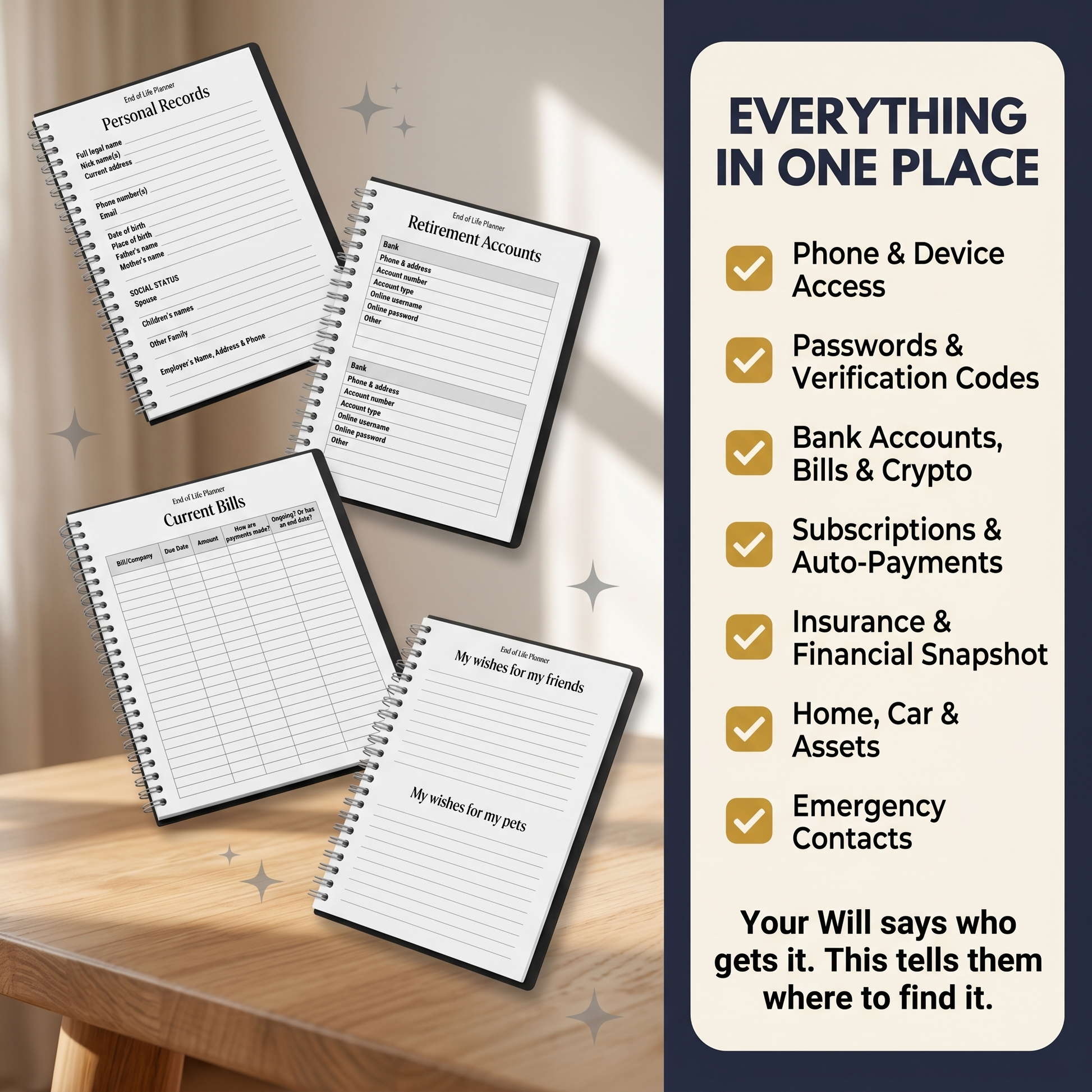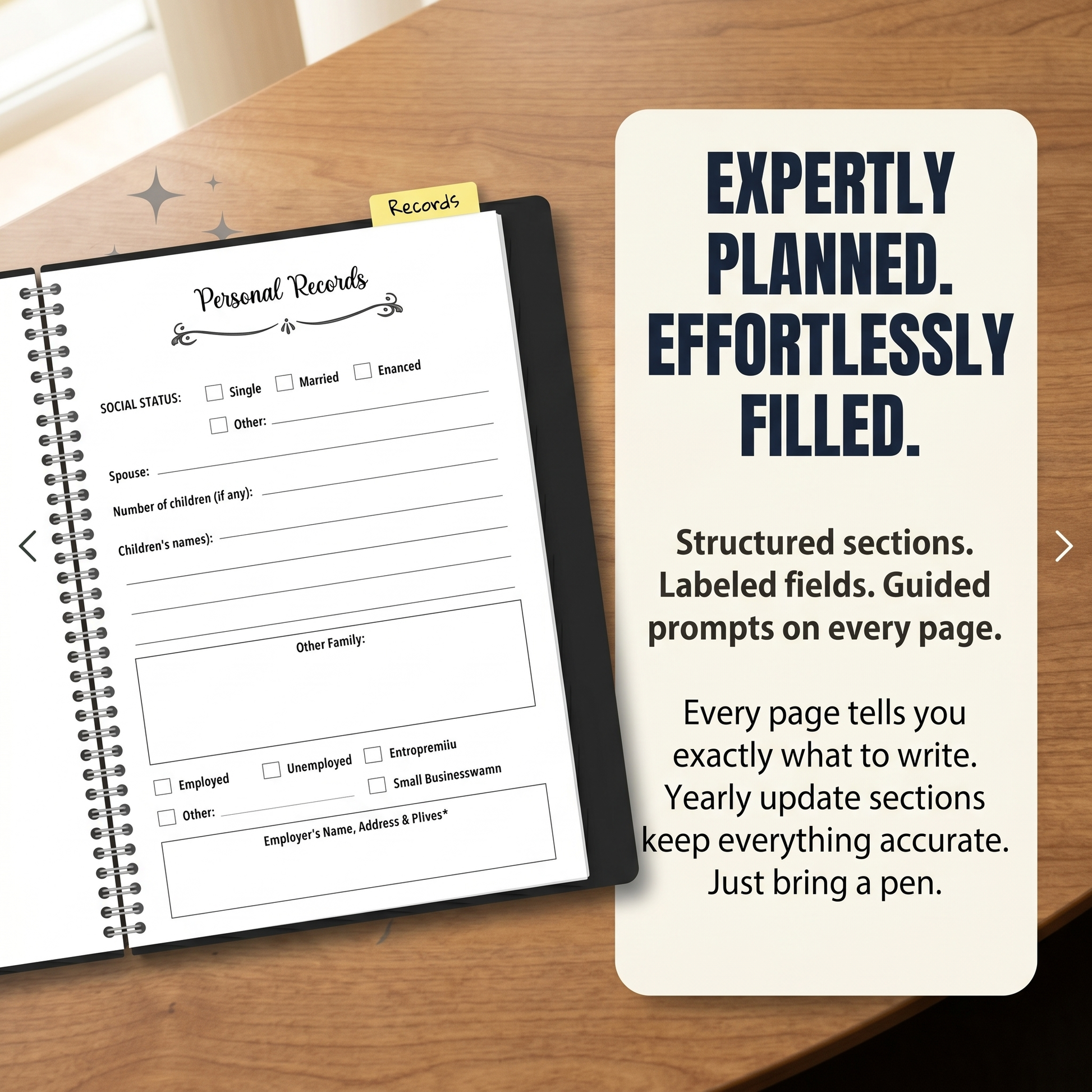 Guided prompts. Clear sections. No starting at blank pages wondering what to include.